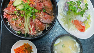 茅ヶ崎焼肉屋<赤とんがらし>日替わり定食ローストビーフ丼タコとキュウリのシーザーサラダスープ・キムチ