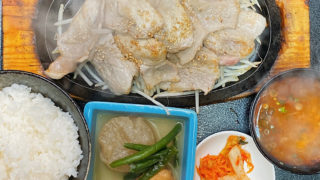 茅ヶ崎焼肉屋<赤とんがらし>日替わり定食鉄板焼き 豚ロースの生姜焼き大根の煮物ライス・スープ・キムチ