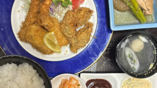 茅ヶ崎焼肉屋<赤とんがらし>日替わり定食ミックスシーフードフライ (エピ・イカ・カキ・カンパチ)タル…続きを読む